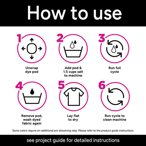 Add color to your fabrics with Tulip Fabric Dye Pods! This easy-to-use Fabric Dye Pod can dye up to 21 ounces of dry fabric (approximately 4 adult large T-shirts) to the full shade — just toss into the wash with salt for all over, even coverage! Note: Project count will vary based on size of garment and amount of dye used. Dyes will appear darker on damp fabric prior to washing and will naturally lighten after laundering. Works best on 100% cotton, linen, ramie and rayon; wool, silk and polyester/cotton mixes will dye to lighter shades. Use multiple dye pods for more saturated color. Recommended for use with High Efficiency washing machines only. Includes 1 (12.3 oz) Petunia (pink) Fabric Dye Pod.